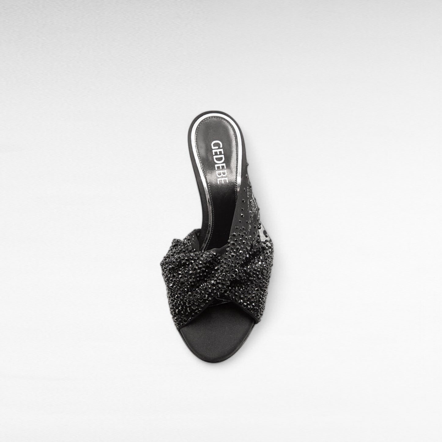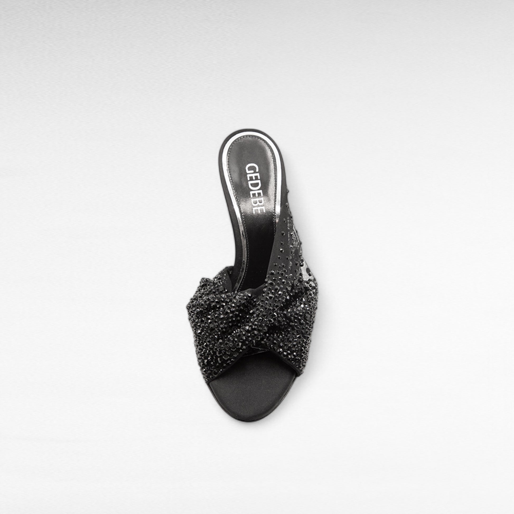 La romantica Mariel mule è caratterizzata da un delicato e prezioso drappeggio di tulle e cristalli.